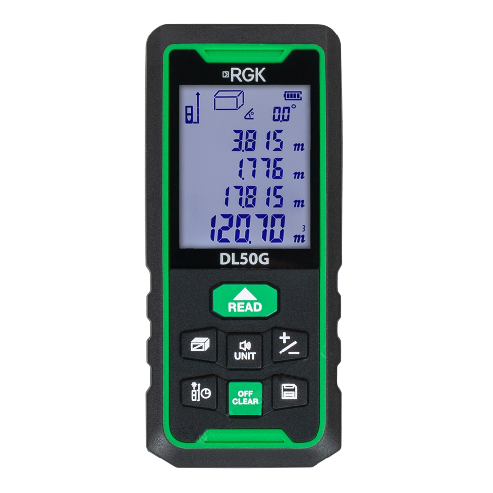 Лазерный дальномер RGK DL50G - зеленый луч служит для измерения расстояний, длин, высот, площадей и объемов. Главное преимущество - яркий зеленый луч, который гораздо лучше красного видно при ярком солнечном свете, например, при работе на улице или в просторных помещениях - ангарах, складах и т.д.