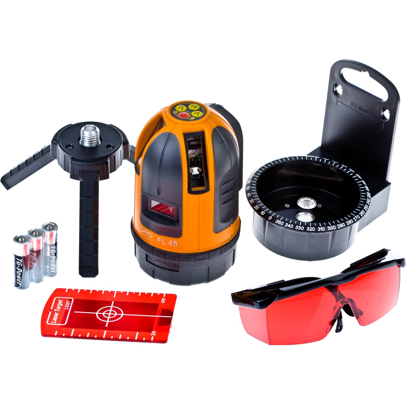 Регулируемый лимб с микрометрическими винтами на корпусе лазерного нивелира FL-45 помогает задавать и закреплять определенный угол при разметке или наводиться на заданную отметку на стене. Диапазон компенсации до ±3,5° и регулируемая ножками подставка-тренога позволяет выравнивать прибор и работать в бытовых условиях без штатива. Также имеется возможность закрепления на стандартный штатив или распорную штангу с резьбой 5/8". При большом отклонении (большим чем диапазон компенсации) подается звуковой сигнал и прибор автоматически отключается.